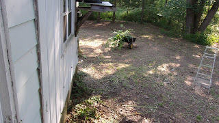 Today the weed-busting moved to the back of the house...or the side that faces south. Jeff had already mowed the lawn...what there was...and today he tackled the overgrown forsythia bushes. Actually the original bush is under the west facing window of the TV room and the rest of the jungle formed because the runners traveled underground. It looked